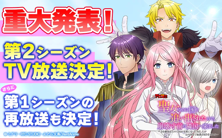 株式会社パピレスが展開する人気モーションコミック、『聖女なのに国を追い出されたので、崩壊寸前の隣国へ来ました』のシーズン2が、2026年1月よりテレビ東京で放送されることが決定しました!また、2025年10月にはシーズン1の再放送も行われ、これまで見逃していたファンも楽しむチャンスが到来します。