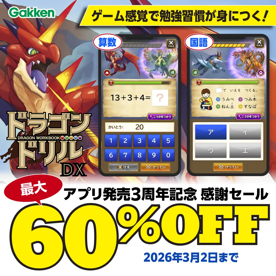 2026年2月13日から3月2日まで、「学研ドラゴンドリル算数/国語の学習アプリで学ぼう!」の3周年を祝って、特別セールが開催されます。今回のセールでは、対象となるサブスクリプションプランが最大60%OFFで提供されるという嬉しいお知らせです。