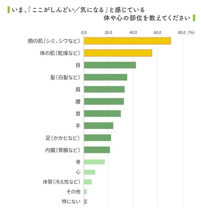 調査の結果、なんと約7割にあたる女性が、シミやシワといった肌トラブルが「しんどい」と答えています。さらに、「肩こりや首こりがひどくて頭痛が頻発している」「体が痛くて気持ちも落ち込んでいる」といった身体的な不調が、さらに心の健康にも悪影響を及ぼしているとの声が多く寄せられました。