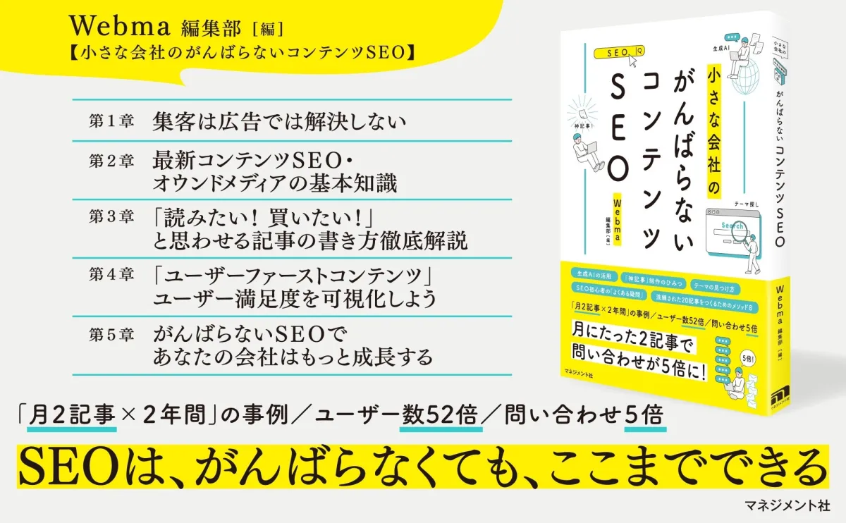著者であるWebma編集部は、これまでに2,000社以上の顧客をサポートしてきた豊富な経験をもとに、SEOのノウハウや事例を分かりやすく解説しています。限られたリソースの中で「がむしゃらに頑張る」のではなく、賢く戦略的に成果を上げる方法が中心です。この点が、多くの中小企業の経営者やWeb担当者にとっての魅力となっています。