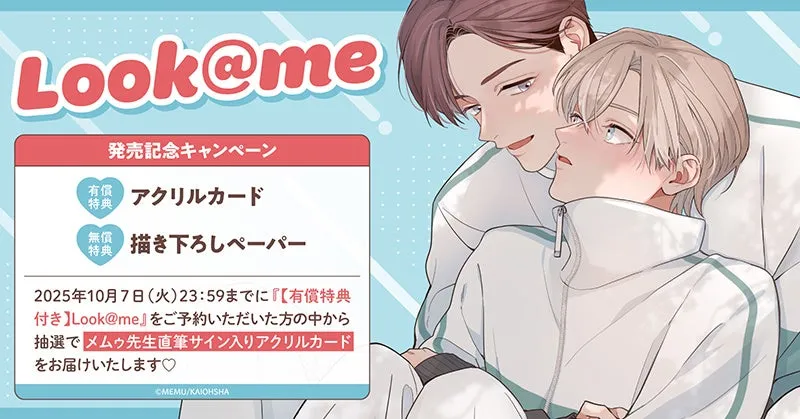 このキャンペーンの対象となる商品は、2025年10月9日に発売される海王社刊のコミックス『Look@me』です。ただし、サイン入りのアクリルカードは特定の条件を満たした方に限り手に入る特典です。