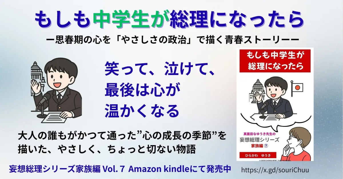 書誌情報は次の通りです。書名:『もしも中学生が総理になったら』、著者:ひらかわゆうき、シリーズ:妄想総理シリーズ家族編⑦、発売日:2025年11月8日、販売価格:税込300円(Kindleストアにて配信)。