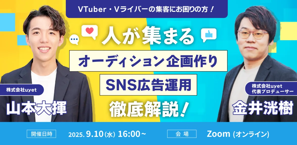 9月10日(水)16時から、「VTuber・Vライバーの集客にお困りの方!人が集まるオーディション企画作り/SNS広告運用徹底解説!」というタイトルのウェビナーが行われます。このイベントは、株式会社uyet(ユエット)が主催し、VTuberやVライバー事務所のオーディション集客に特化した内容となっています。特に、これから業界に参加したいと考えている方や、集客に悩む企業担当者にとっては必見の情報が盛り込まれています。