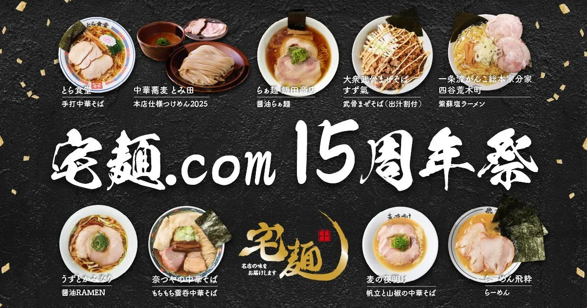2025年7月14日(月)、国内最大のラーメン専門通販サイト「宅麺.com」を運営するグルメエックス株式会社が、設立15周年を迎えます。この記念すべき日に合わせて、特別企画「宅麺15周年祭」を開催します。人気のラーメン店が集結し、初めて登場する店舗も含む全9種類のラーメンが、オンラインで手に入るチャンスをお見逃しなく!