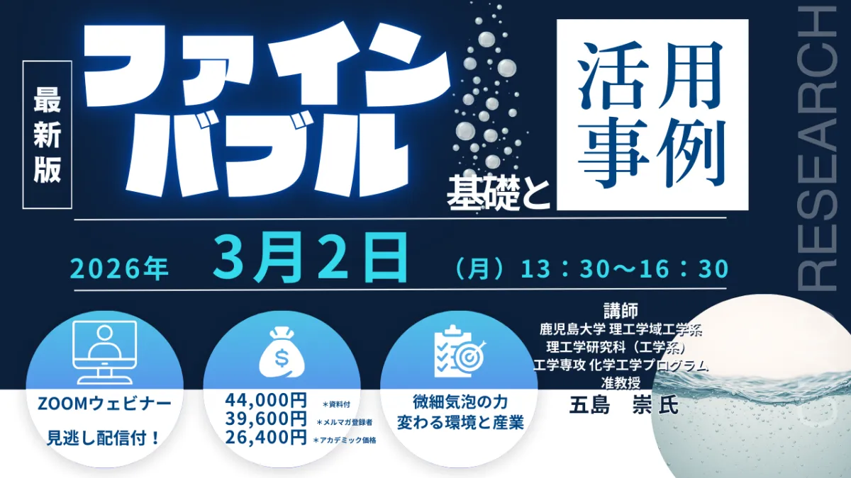 2026年3月2日(月)に、株式会社シーエムシー・リサーチ主催のセミナー「ファインバブルの基礎と活用事例」が開催されます。このオンラインイベントは、ZOOMを使用して行われ、録画したセミナーは後日見逃し配信が可能です。受講者は初めての方でも気軽に参加でき、ファインバブル技術の基礎知識を学べます。