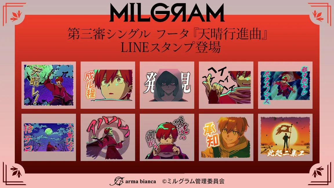 DECO*27×OTOIRO×山中拓也という豪華なコラボレーションによる視聴者参加型音楽プロジェクト『MILGRAM -ミルグラム-』から、ファン待望の新LINEスタンプが登場します。新たに配信されるのは、第三審シングル『天晴行進曲』と連動した囚人別ラインスタンプ第3弾です。
