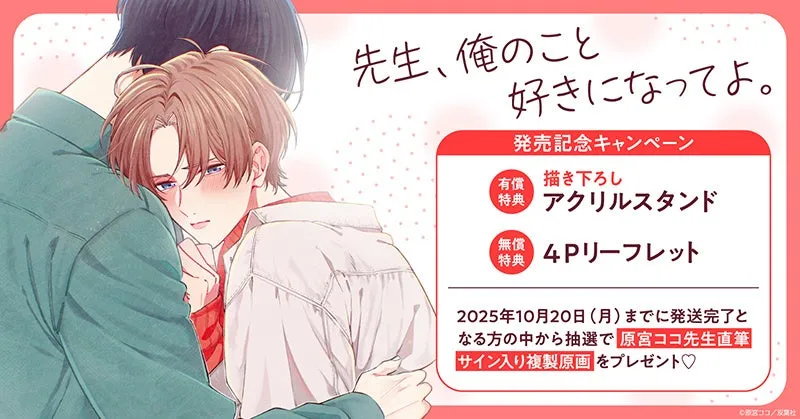 このたび、人気BL作家・原宮ココ先生の最新コミックス『先生、俺のこと好きになってよ。』が、2025年9月19日に双葉社から発売されることが発表されました。この新刊のリリースを記念して、運営するホーリンラブブックスでは、多彩な特典が用意された豪華なキャンペーンが開催されます。特に注目すべきは、原宮ココ先生の直筆サイン入り複製原画が抽選で当たるチャンスです。これはファンにとって見逃せない貴重な機会と言えるでしょう。