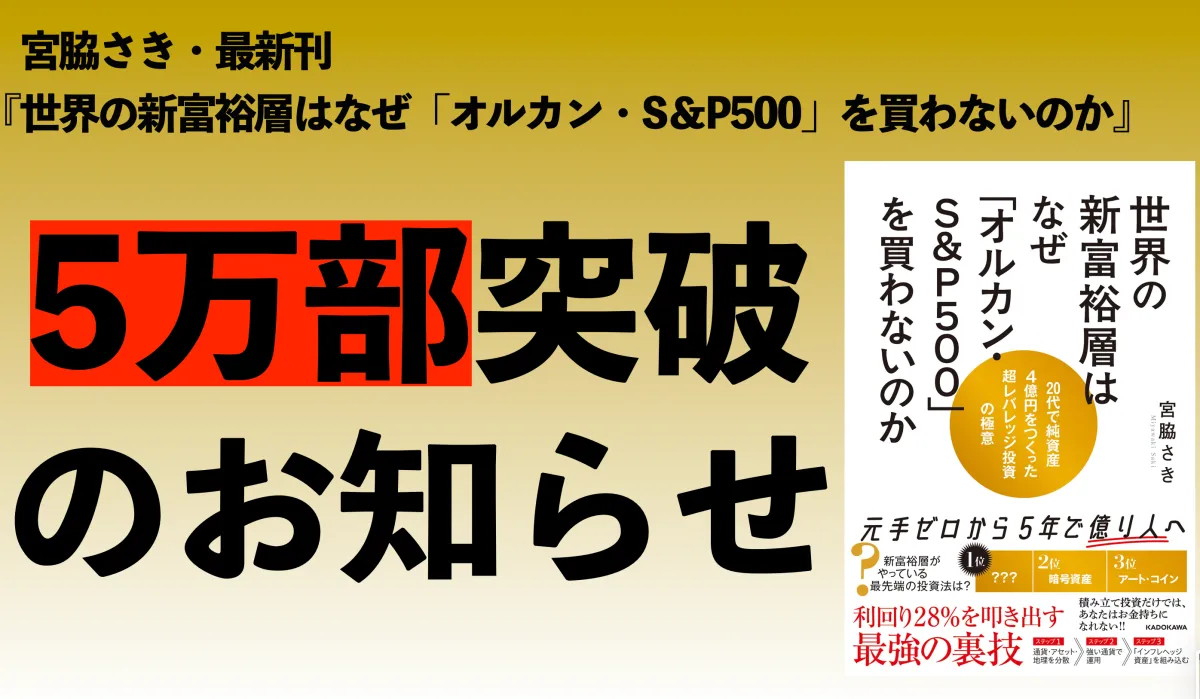 2025年8月26日に出版された宮脇さきの新刊『世界の新富裕層はなぜ「オルカン・S&P500」を買わないのか 20代で純資産4億円をつくった超レバレッジ投資の極意』が、発売からわずか瞬く間に5万部を突破しました。この本は、特に20代の若い世代に向けて未来の資産形成のカギを握る投資戦略を明かしており、多くの読者からの支持を得ています。