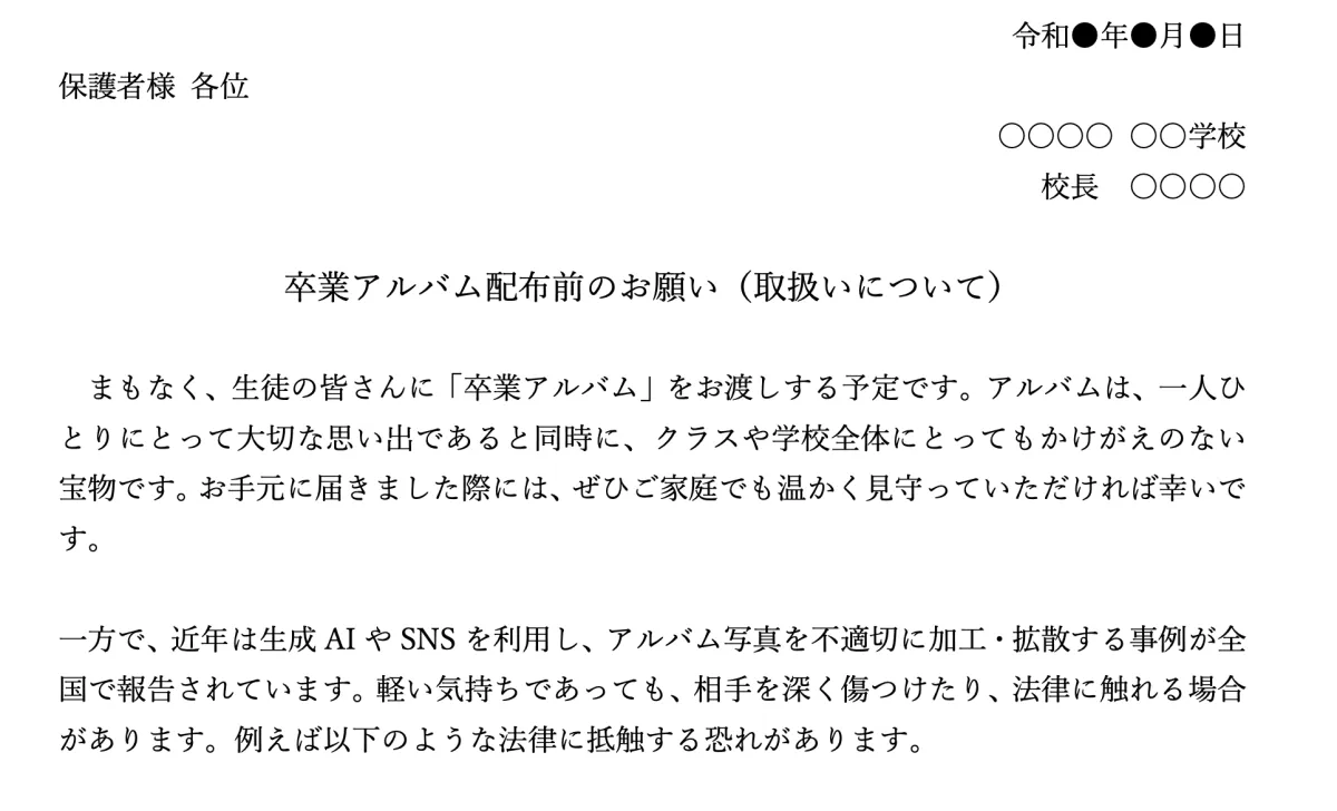 夢ふぉとは、保護者に向けた注意喚起資料を無償で制作し、全国の学校を通じて配布できるようにしています。この資料は、卒業アルバムの扱いについての指針を提示するものです。