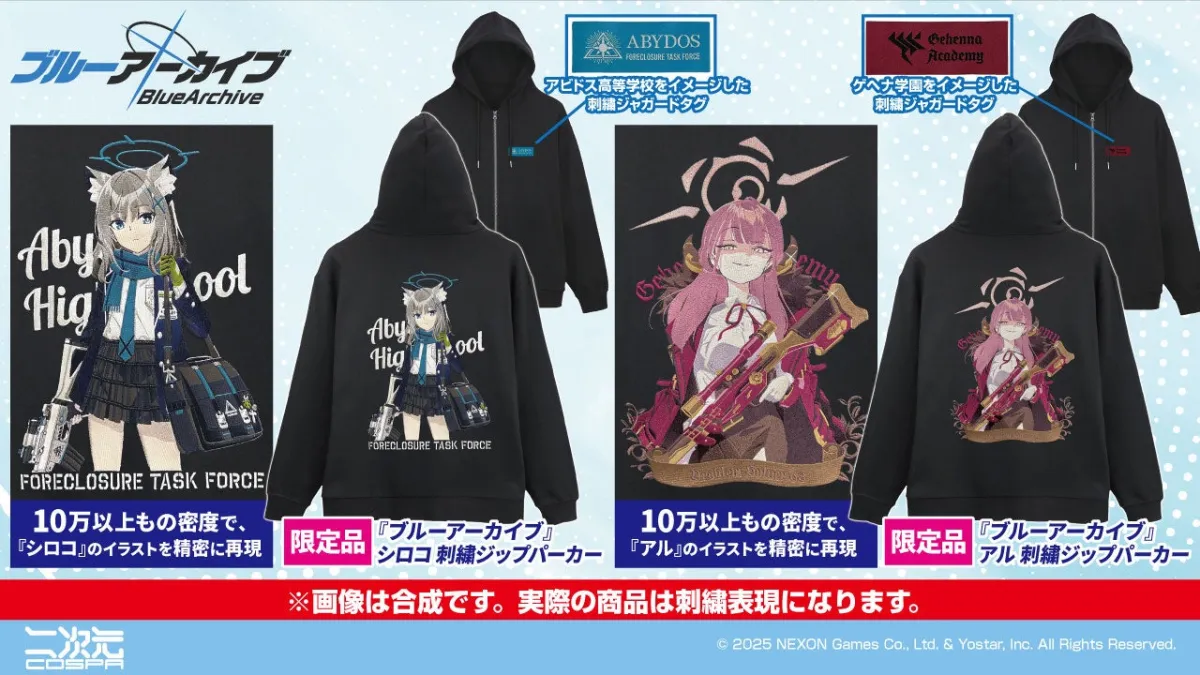 - シロコ、アルそれぞれのデザインで展開。密度の高い刺繍によって、キャラクターの魅力が引き立てられています。これを着ることで、ただのアパレルを超えた満足感が得られるでしょう。