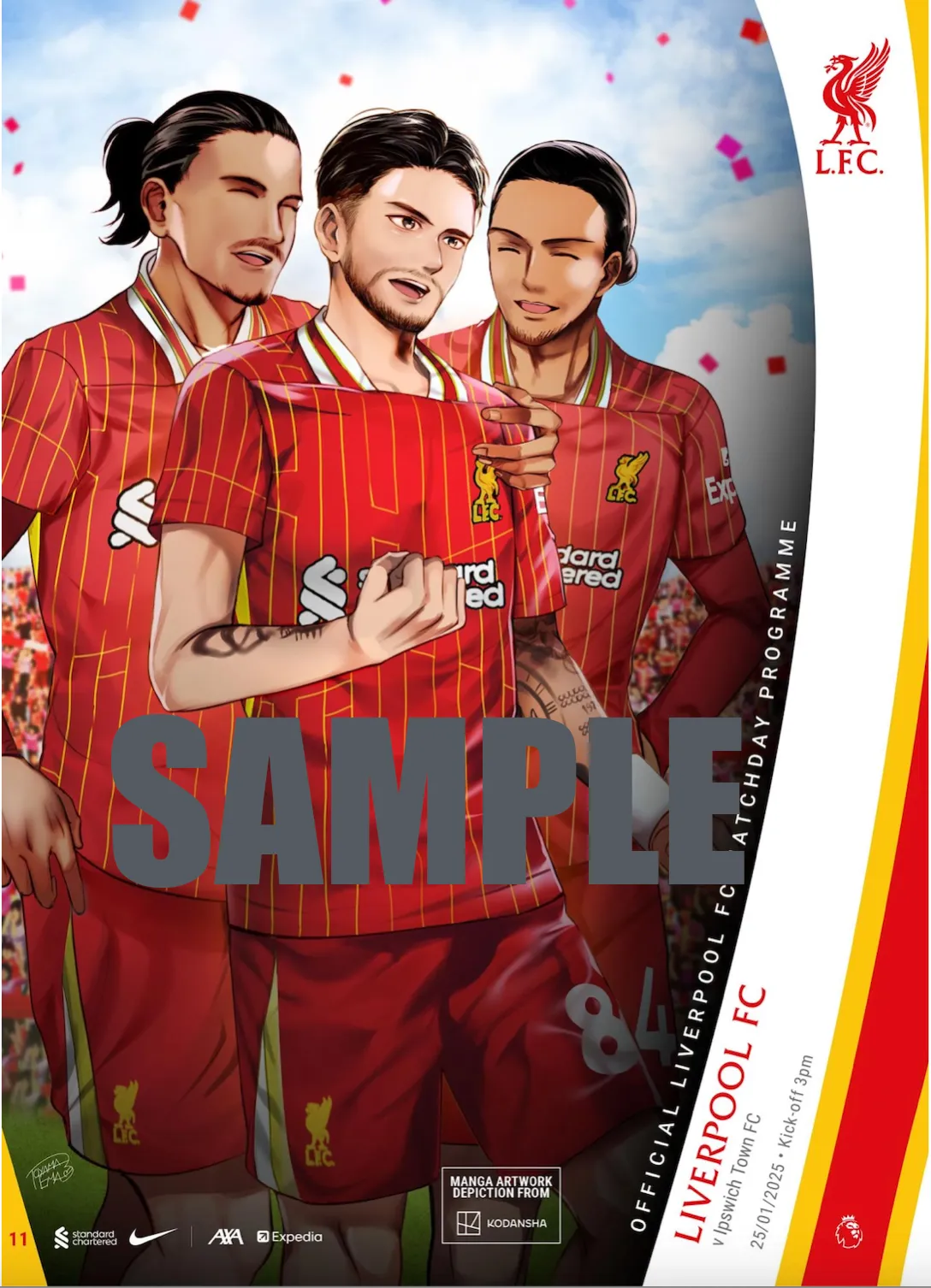 まず、実際にサッカーの試合と少年・少女雑誌を結びつけた第一弾として、人気漫画家の遠山えま氏が、リバプールFCの試合プログラムの表紙を描き下ろしました。このイラストにはドミニク・ソボスライ選手を中心に、ヴァージル・ヴァン・ダイク選手とダーウィン・ヌニェス選手が勝利を祝う情景が描かれており、少女漫画ならではの繊細さと華やかさが気持ちを盛り上げます。実際、ソボスライ選手はその試合でゴールを決め、漫画の世界が現実と見事にリンクした瞬間も見逃せません。