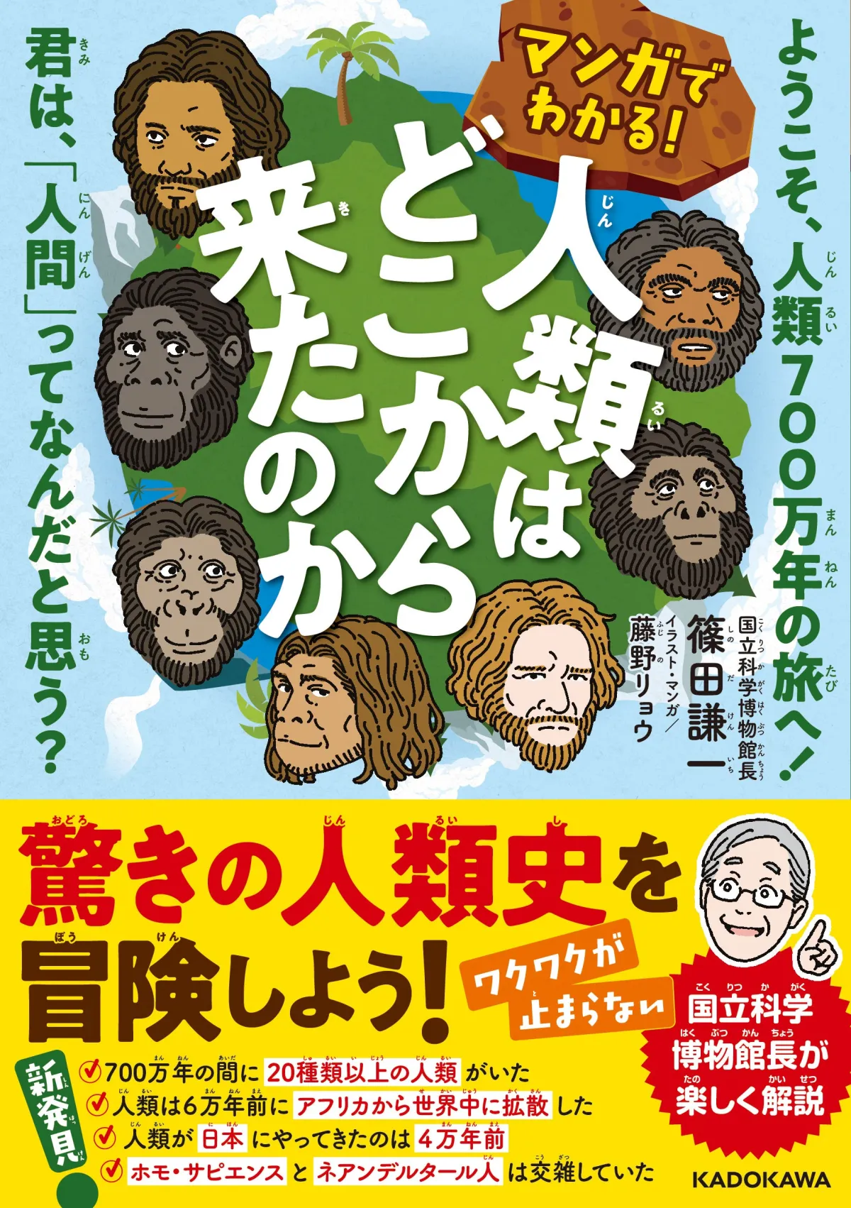 2025年6月2日(月)、株式会社KADOKAWAから新刊『マンガでわかる! 人類はどこから来たのか ようこそ、人類700万年の旅へ! 君は、「人間」ってなんだと思う?』が発売されます。本書は人類の誕生から進化の歴史を紐解くもので、著者は国立科学博物館長の篠田謙一氏、イラスト・マンガを手掛けるのは藤野リョウ氏です。