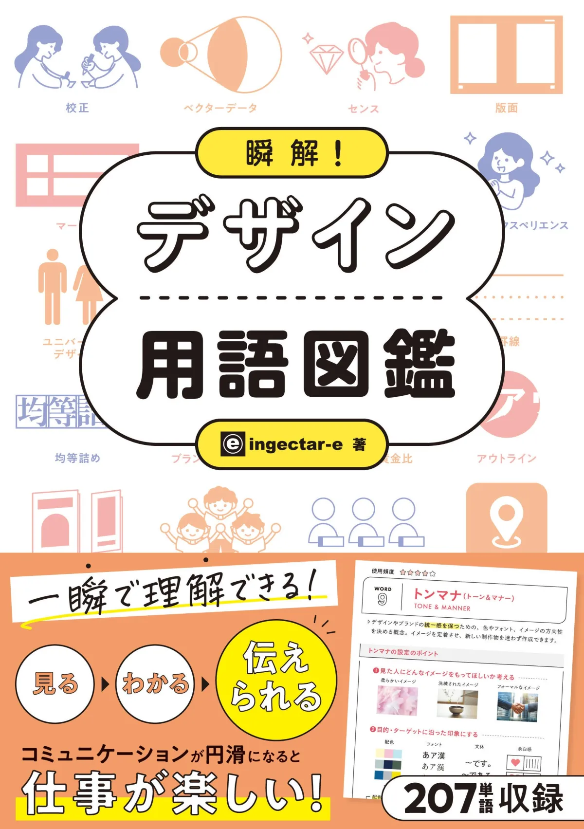 著者のingectar-eは、デザイン業界で広く知られた存在で、数多くのヒット作を持つプロフェッショナル。彼らは、デザインに必要な基本用語や概念、およびそれを含む様々な要素・技法を、豊富なイラストと共に提供しています。