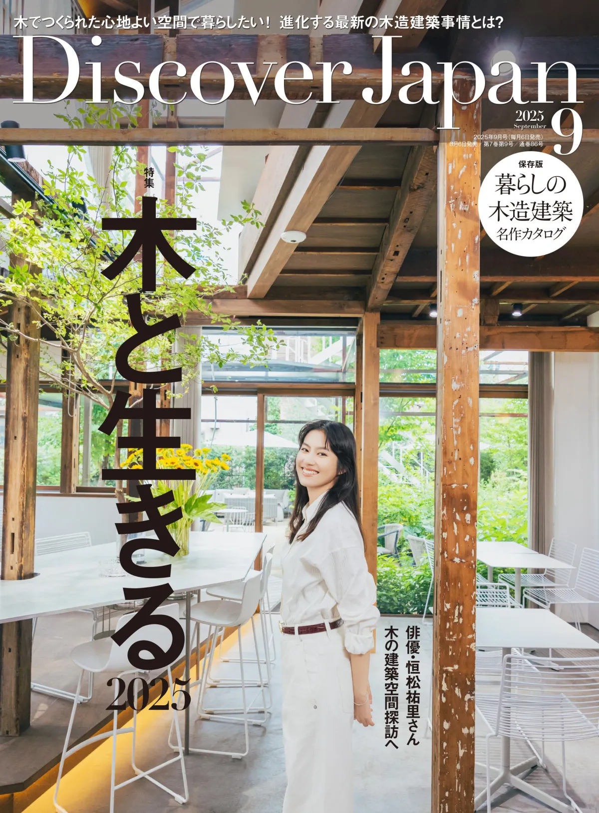 2025年9月号の『Discover Japan(ディスカバー・ジャパン)』が8月6日に発売されました。今回の特集テーマは、「木と生きる2025」。森林が国土のほぼ70%を占める日本において、再び木に注目が集まっています。地球温暖化への対策として木材が見直され、研究開発も進む中、中高層の木造建築が普及してきました。木は、人々の心と身体に多くの良い影響を与えることが科学的にも分析されており、木を取り入れた空間の重要性がますます広がっています。