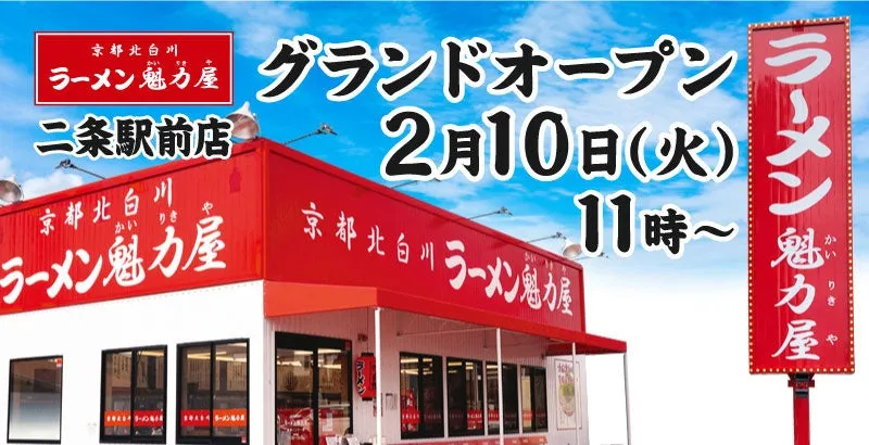 2026年2月10日、京都府・二条駅前に「京都北白川 ラーメン魁力屋 二条駅前店」が新たにオープンします。約2年ぶりの出店となる魁力屋は、ラーメン好きだけではなく、広く市民に親しまれてきたブランドです。初日のオープンを記念して、特別な価格で人気メニューを堪能できるチャンスが用意されています。