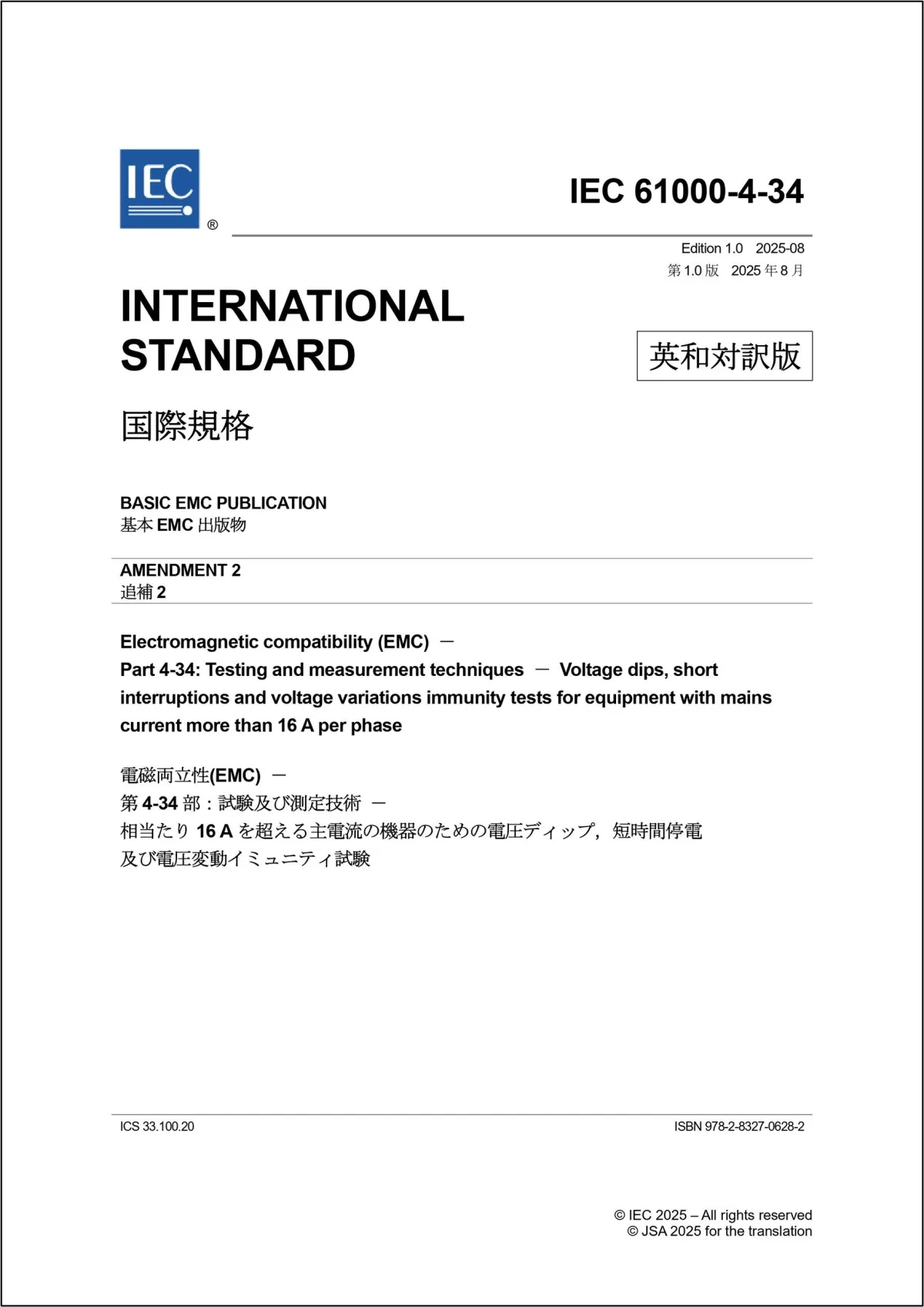 一般財団法人日本規格協会(JSA)は、2025年10月1日(水)に「IEC 61000-4-34 Amd.2 Ed. 1.0:2025 (b)」の邦訳版を発行することを発表しました。この規格は、主に16Aを超える電流を扱う機器における電圧ディップ、短時間停電、および電圧変動に対する耐性を評価するための試験および測定技術を定めたものです。