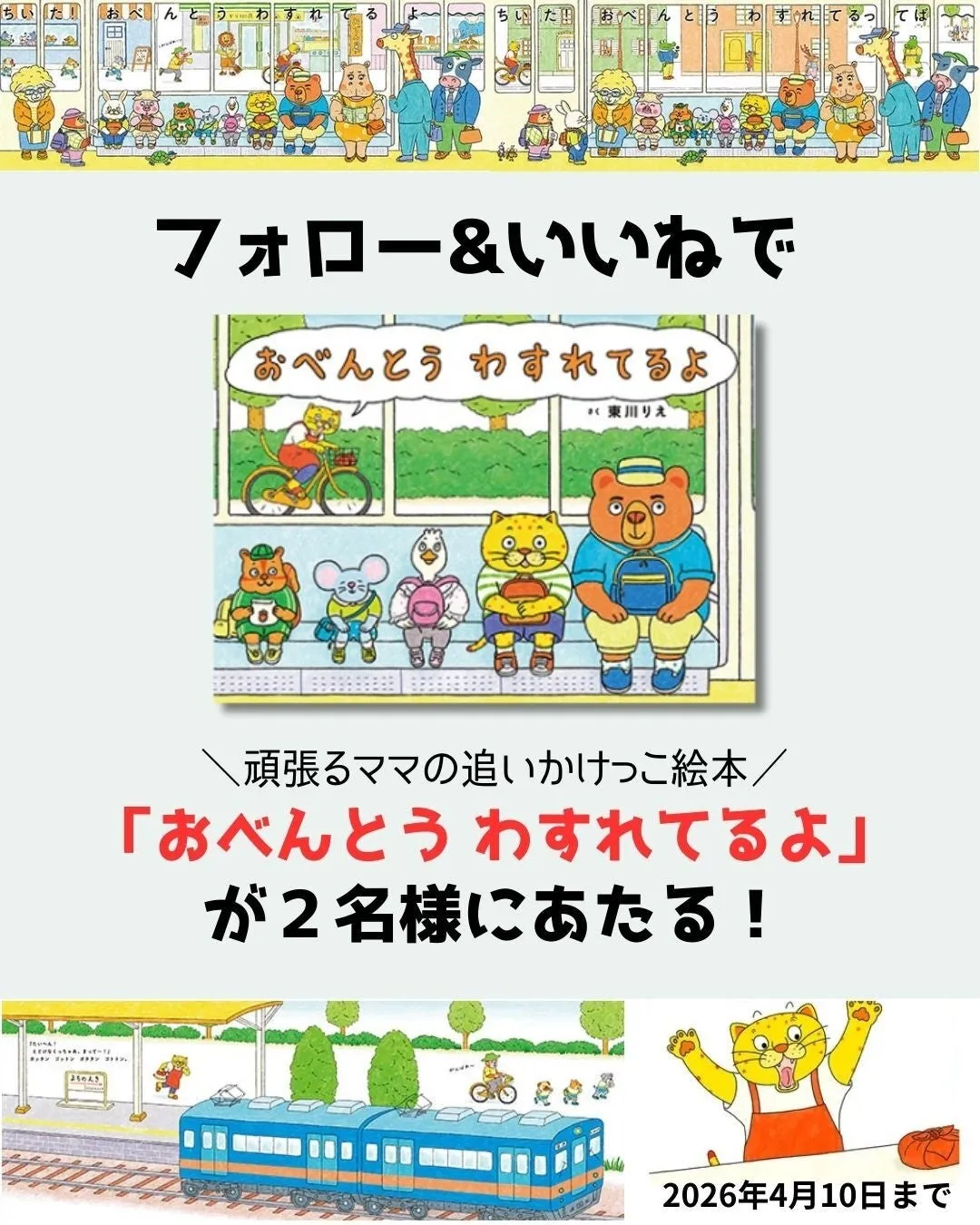 対象となる絵本は、2026年3月5日に発売予定の『おべんとうわすれてるよ』です。この絵本は、作家の東川りえによって描かれ、楽しい遠足の日にお弁当を忘れてしまったちいたくんのお話を描いています。ママが懸命にお弁当を追いかける様子が描かれる、ほほえましいストーリーが特徴です。