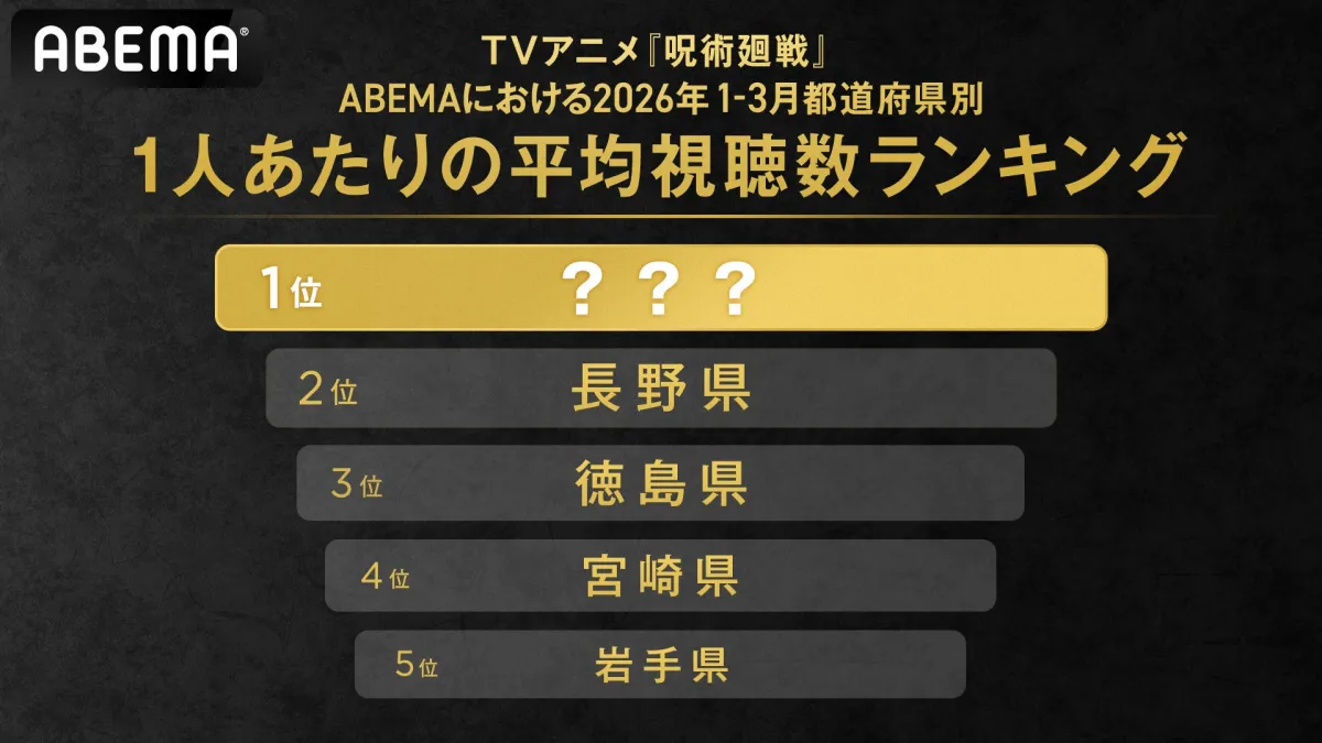 新しいテレビ体験を提供する「ABEMA」が、2026年の初めに最も視聴されたアニメ『呪術廻戦』の県別視聴数ランキングを発表しました。令和のアニメブームを牽引する本作の人気が、地域ごとにどう広がっているのかが注目されています。