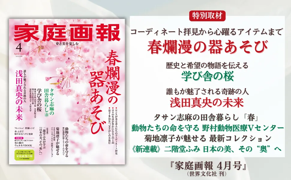 3月1日に発売される『家庭画報 4月号』は、春の訪れを感じさせる多彩な特集が魅力です。巻頭特集「春爛漫の器あそび」では、器のコーディネート術を学び、様々な国籍や時代の器の魅力を探求します。特に益子や多治見といった名窯地の最新情報にも触れ、器の進化を感じることができます。
