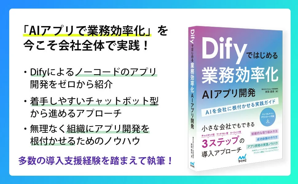 著者である岸田崇史氏は、東京工業大学物質理工学院を修了後、味の素株式会社にて機械学習を活用した半導体材料開発に従事しました。その後、フリーランスエンジニアを経て2023年に生成AI事業を展開する株式会社Omlucを設立。彼はDifyの導入支援サービスを行い、数多くの企業に生成AIの導入をサポートしています。