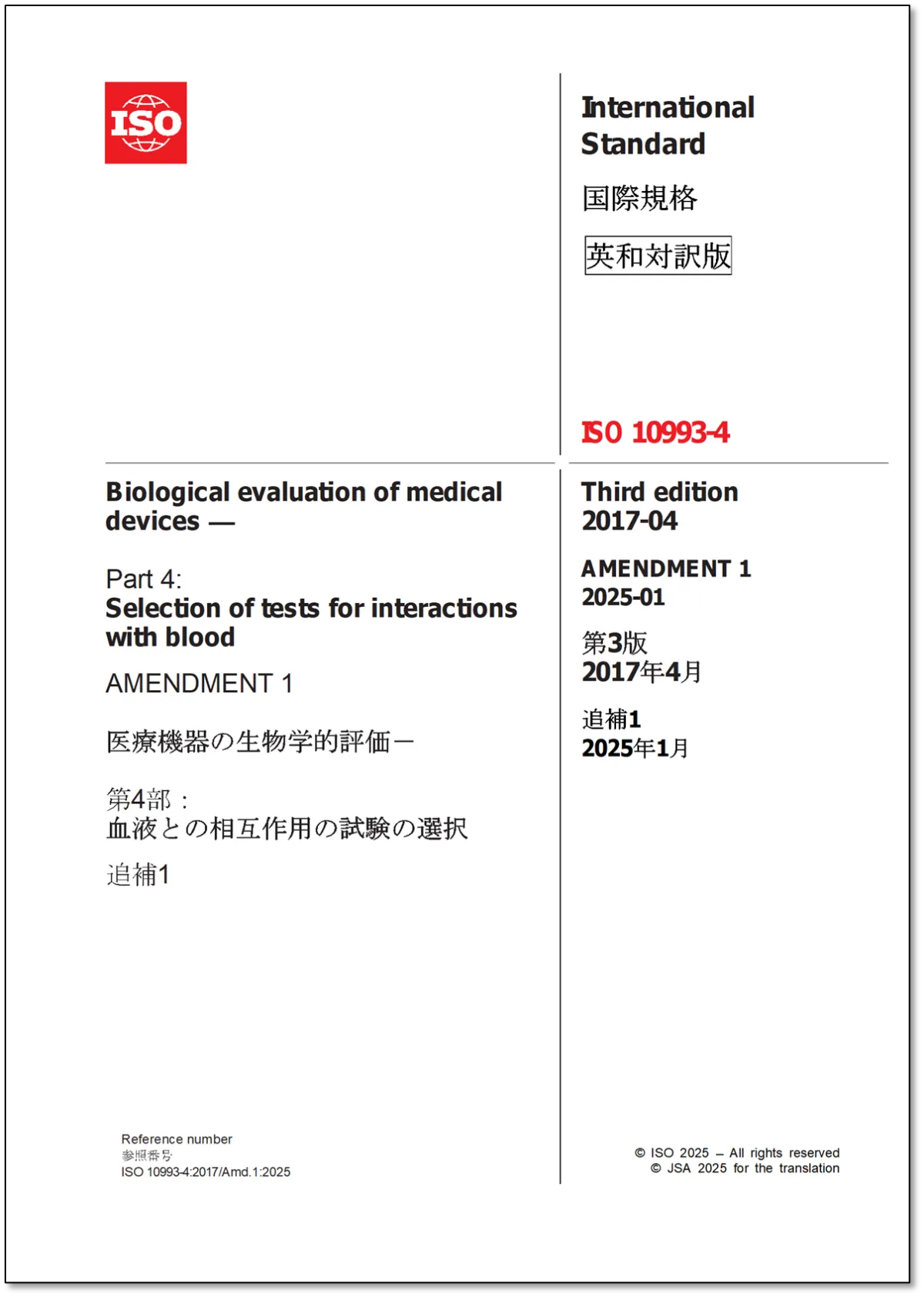 今回の発行される規格は、2つの重要な規格が含まれています。1つ目は「ISO 10993-4:2017/Amd 1:2025」で、医療機器と血液との相互作用を評価するための基準が定められています。2つ目は「ISO 18562-2:2024」で、ヘルスケア用途における呼吸ガス経路の生体適合性を評価するための規格です。
