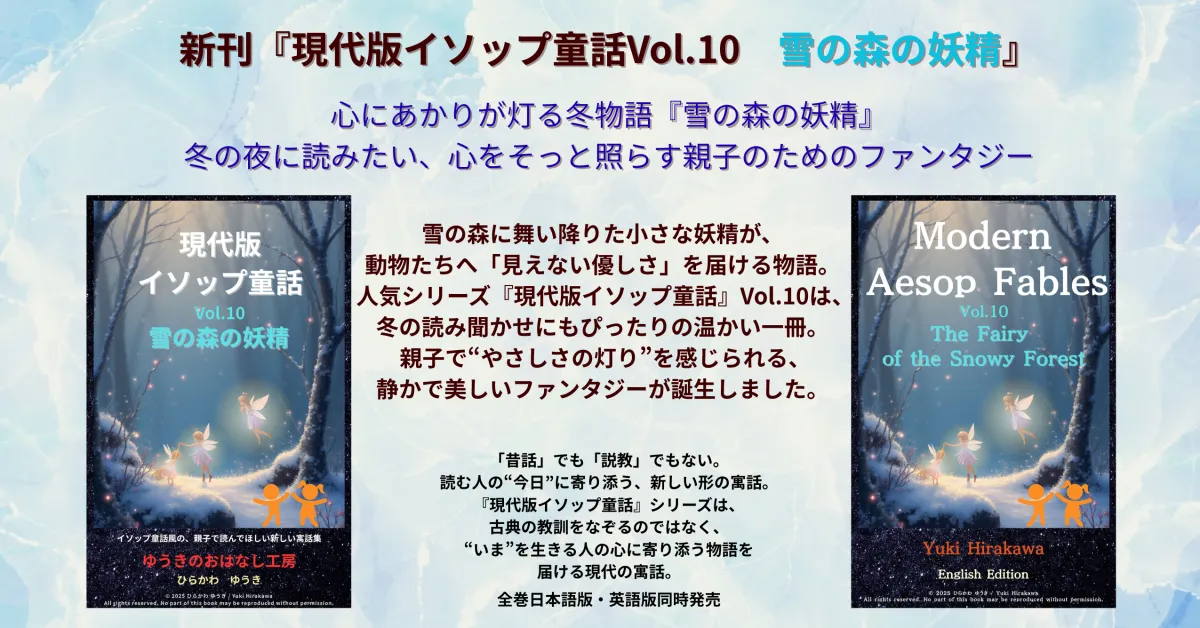 2025年11月、ひらかわゆうきによる『現代版イソップ童話』シリーズの第10巻『雪の森の妖精』が刊行されます。この新作は、冬の夜にぴったりな親子向けの物語で、心にやさしさのあかりを灯すファンタジーです。