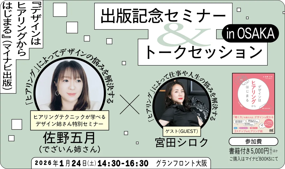 『デザインはヒアリングからはじまる』の発売を記念して、2026年1月24日(土)に特別イベントが開催されます。ヒアリングテクニックを学ぶセミナーや、著者の佐野さんと仕事例を紹介するコーナーも予定されています。参加費は書籍代込みで5,000円(税込)、先着80名限定ですので、興味がある方は早めのご応募をおすすめします。