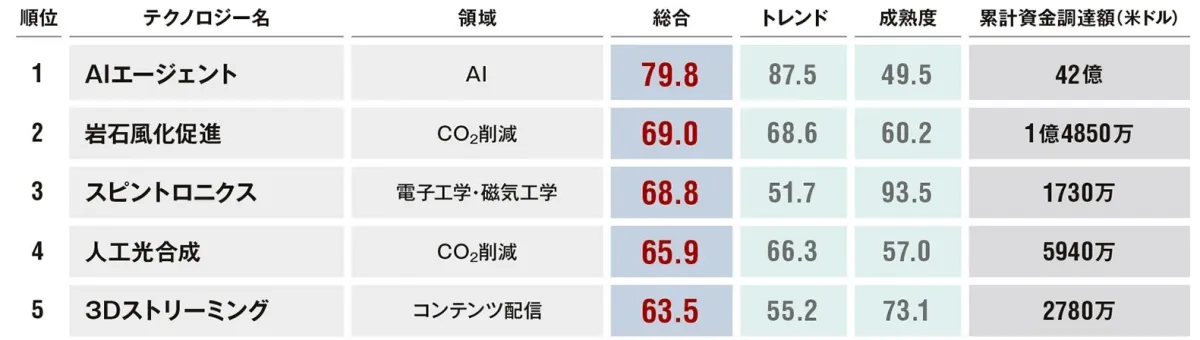 第1位は「AIエージェント」です。生成AIとしての役割が大きく、今年度中に40億ドルを超える資金調達が見込まれています。これは、AI関連の技術発展の証と言えます。