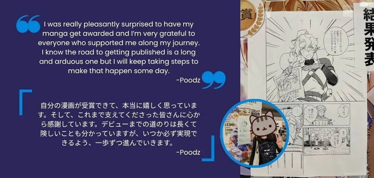 PoodzはDEOWが運営する「Global Tokiwaso Project」に参加しており、今回の受賞はそのプログラムにおける成果の一つです。『Rosalie & Burkhardt』は、電撃大王コミックの即日賞で晴れて「大賞」を受賞しました。この受賞がきっかけとなり、月刊誌への掲載が決定したことは、何よりも画期的なニュースです。