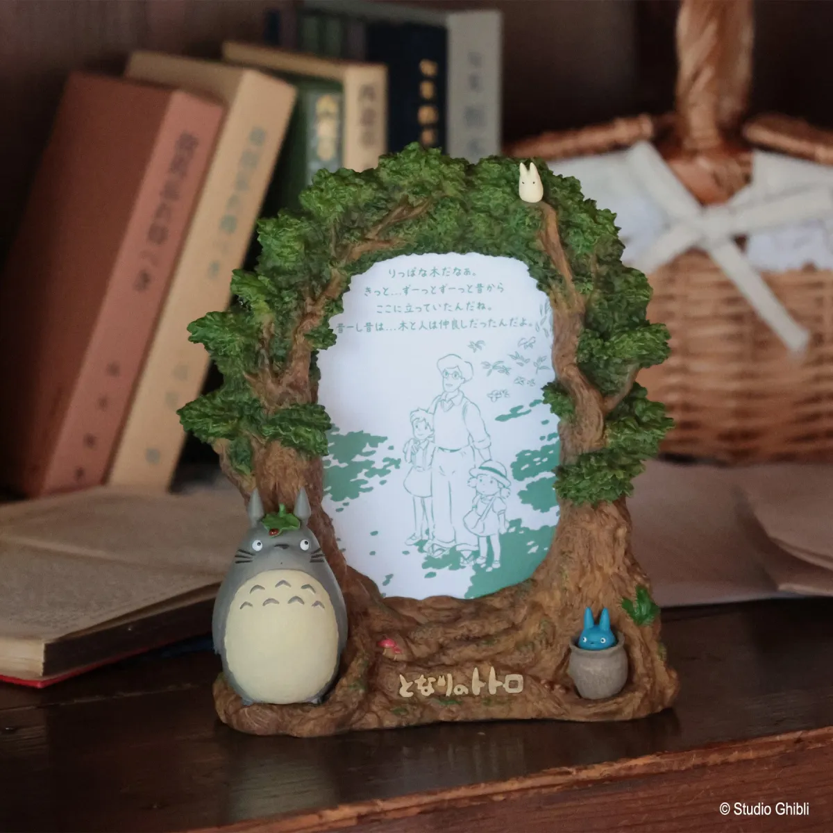 まず注目すべきは、『となりのトトロ フォトフレーム トトロの森』です。このフォトフレームは、L版サイズの写真を収納できる仕様になっており、中に入れた写真がまるで木々に囲まれているかのような印象を与えます。フレームのデザインには、幹の質感や葉っぱの彩色が絶妙に再現され、映画のあたたかい雰囲気を表現。左側には葉っぱをかぶったトトロ、右側には木の根元から覗く中トトロ、そして上部には小トトロが描かれていて、どの視点から見ても楽しめる遊び心が感じられるデザインです。お気に入りの写真を入れることで、トトロたちがその写真を覗き込んでいるようなシーンを楽しむことができます。