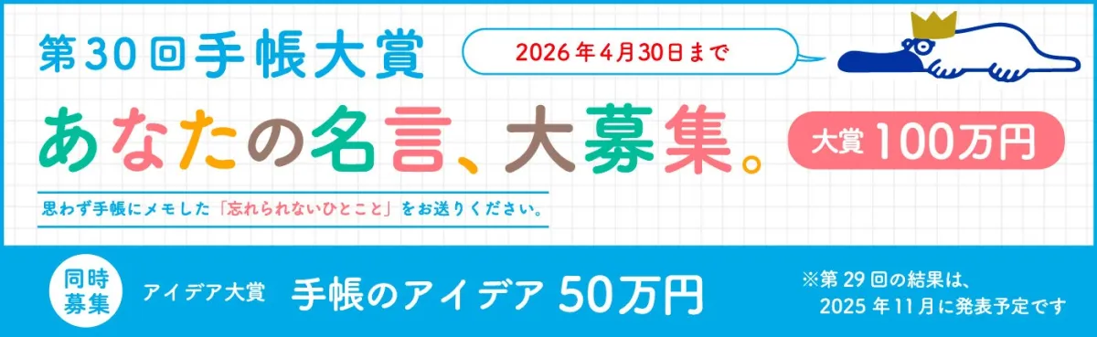手帳大賞とは、思わず手帳にメモしたくなる名言や斬新なアイデアを募集するコンテストです。「身近な人の名言」の他、新しい商品やその使い方のアイデアも受け付けており、応募者は楽しみながら参加できる仕組みになっています。手帳の未来をともに創造するこの賞に、ぜひ参加してみてはいかがでしょうか。