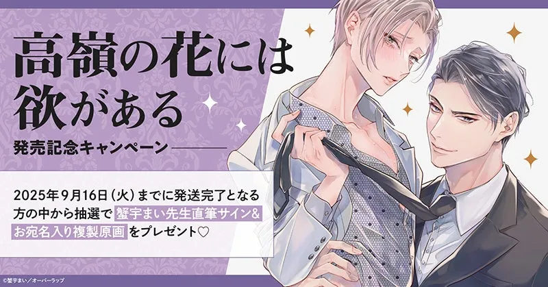 今回のキャンペーンでは、2025年8月15日に出版される蟹宇まい先生の新作『高嶺の花には欲がある』を対象としています。この本を購入し、指定された期間内に発送が完了すれば、自動的にキャンペーンに応募することができます。応募の中から抽選で、蟹宇まい先生自身の直筆サインが入った複製原画が当たるという、非常に貴重なプレゼントが用意されています。
