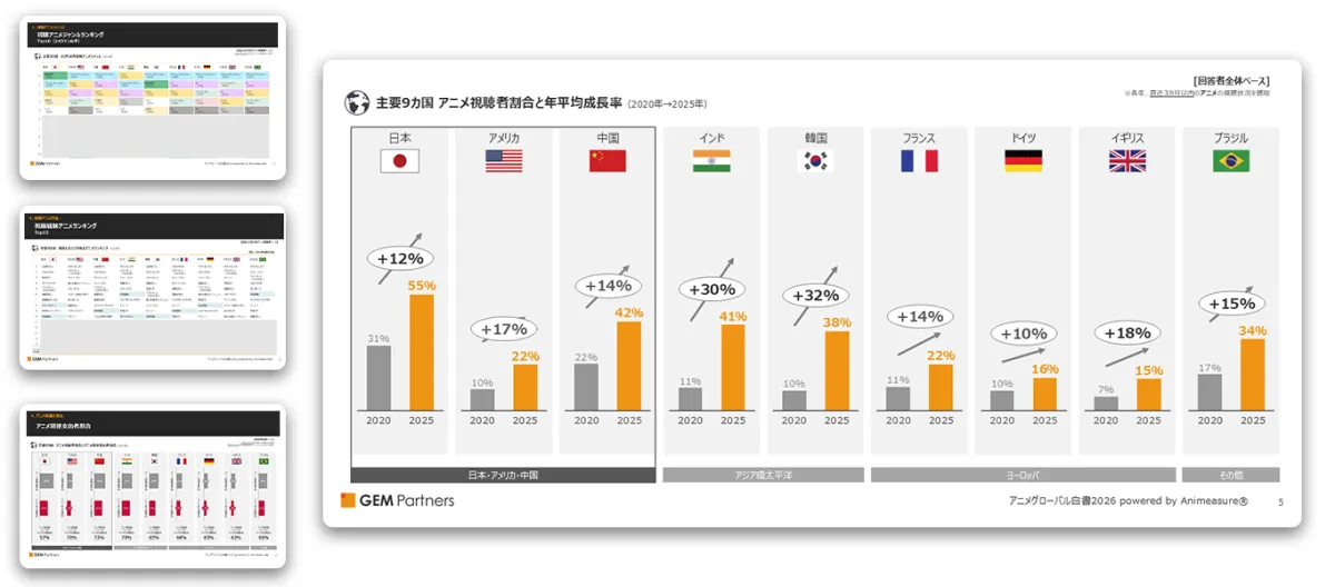 2020年から2025年にかけてのアニメの世界的な広がりとその熱狂を分析した「アニメグローバル白書2026」が、GEM Partners株式会社から発刊されました。この白書は、アニメ好きたちの動向や市場の変化を捉え、グローバルな視点での分析を行っています。