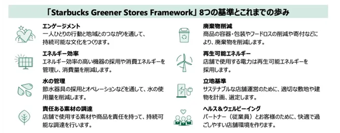 スターバックスでは、2018年から「Greener Stores Framework」を採用し、環境負荷を低減した店舗運営を進めています。このフレームワークは、エネルギー効率、水の管理、廃棄物削減、責任ある素材の調達などから成り立っており、実際に日本では2021年に初の認証店舗がオープンしました。