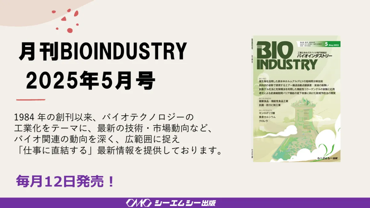 毎月12日、バイオテクノロジーに特化した専門誌『月刊BIOINDUSTRY』が発行されます。2025年5月号も例外ではなく、バイオ産業の最新動向や技術が詰まった内容となっております。