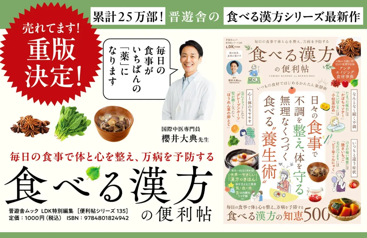 そんな願いを叶えてくれる一冊、『食べる漢方の便利帖』が登場しました。この本は、著者であり国際中医専門員である櫻井大典先生が、食材を通じて健康を促進する「食べる漢方」の効果を紹介しています。