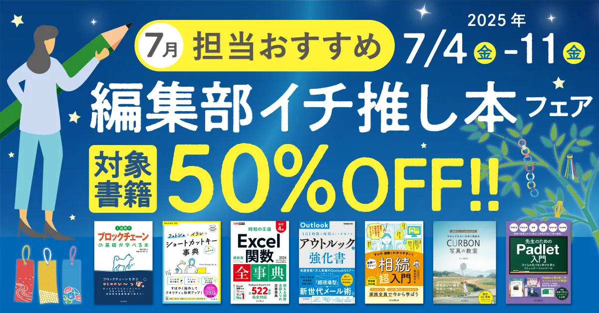 インプレスグループが推奨する電子書籍を集めた「担当おすすめ!編集部イチ推し本フェア」が、2025年7月4日から7月11日までの期間限定で開催されます。このフェアでは、人気の書籍が50%オフで購入できる絶好のチャンスが到来。ITやビジネス、デザイン分野に特化した多彩な良書が登場し、編集者の熱い推しコメントも要チェック!