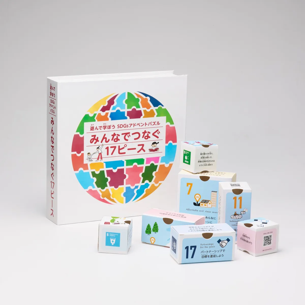 一つ目は、「遊んで学ぼう SDGsアドベントパズル」です。この作品は、SDGsの17の目標を大人から子どもまで実践できる簡単な行動に落とし込み、アドベントカレンダー形式のパズルで表現。ピースが集まることで達成感を促し、SDGsを「自分ごと」として捉えることを狙った素晴らしい教育ツールとなっています。